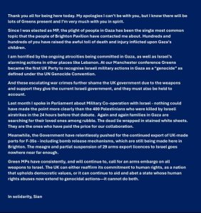 Although unable to attend on the day, Brighton Pavilion MP Sian Berry sent a well-received statement (which you can read, below) against Israeli genocide and in support of the people of Gaza.