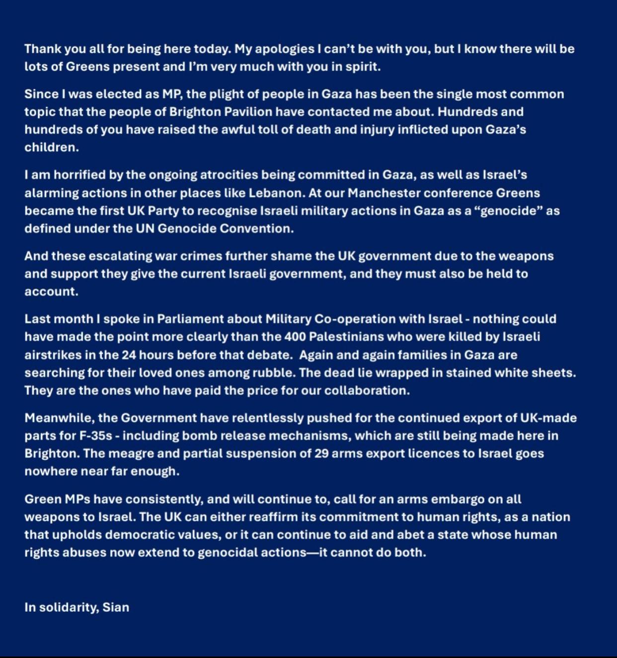 Although unable to attend on the day, Brighton Pavilion MP Sian Berry sent a well-received statement (which you can read, below) against Israeli genocide and in support of the people of Gaza.