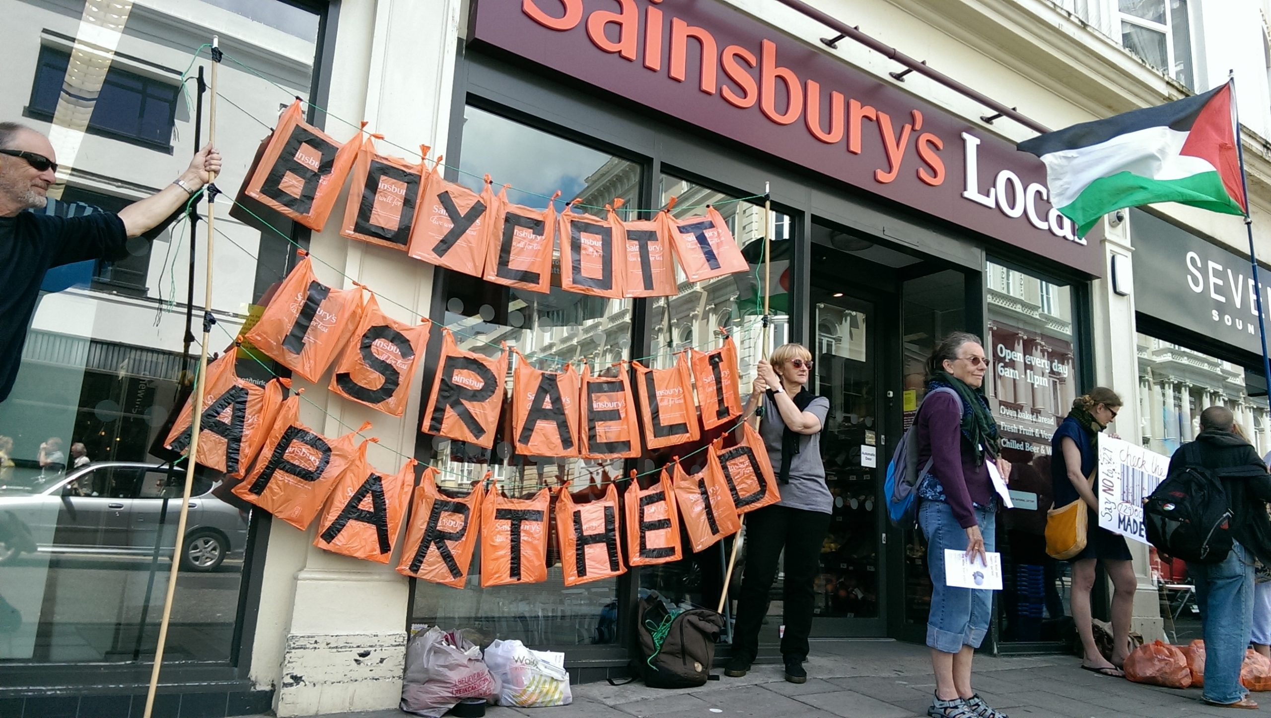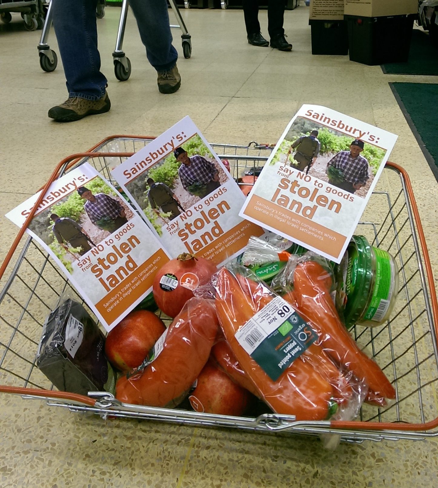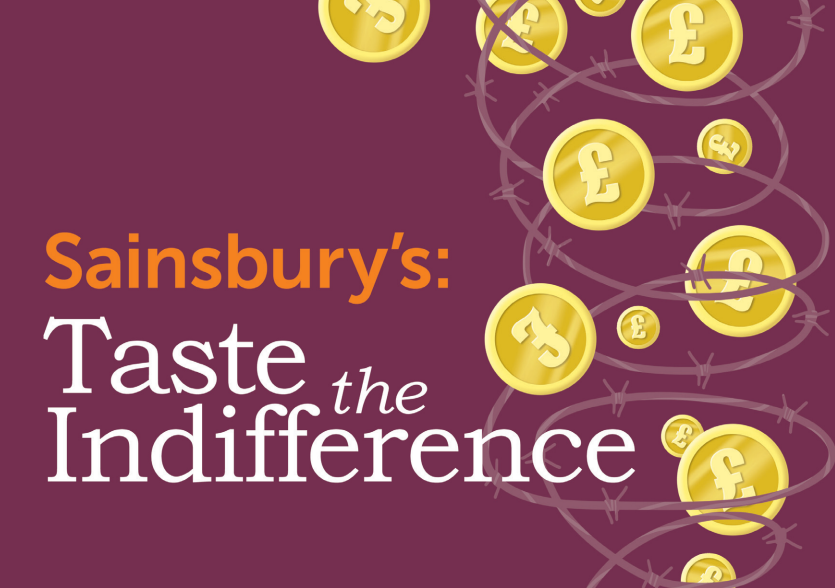 Sainsbury’s uses suppliers that trade in products from illegal Israeli settlements. The supermarket is therefore profiting from Israel’s illegal occupation. The ‘Taste the Indifference’ slogan and logo poke fun at Sainsbury’s long-standing ‘Taste the Difference’ food range – as well as the supermarket’s lukewarm response to our campaign.